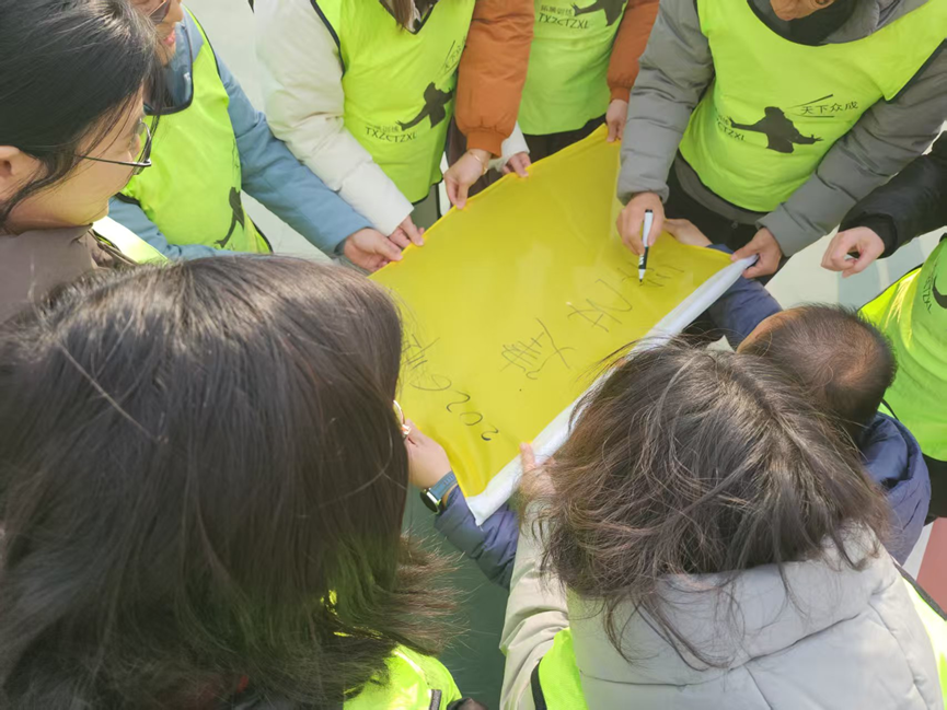 活动伊始,教练通过趣味破冰游戏快速打破成员间的陌生感与拘谨感,“桃花朵朵开”“团队组建”等互动环节,让现场气氛迅速升温。大家随机分组,在短时间内完成队名构思、队旗设计、队训拟定与队歌创作,各组以独特的方式展示团队风采,铿锵的口号、创意的造型,充分彰显了团队的活力与创意,也让“团结协作”的种子在互动中悄然生根。