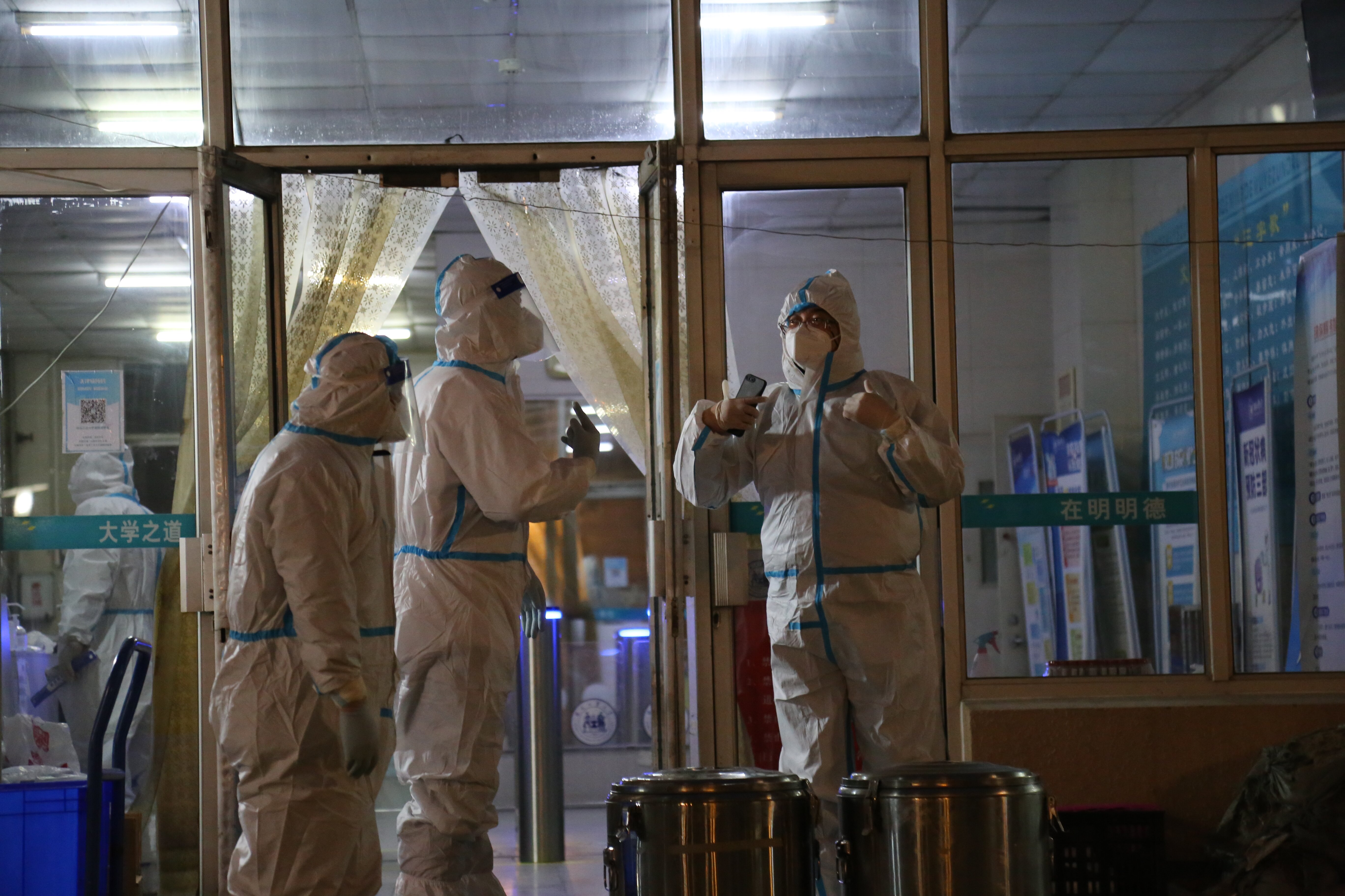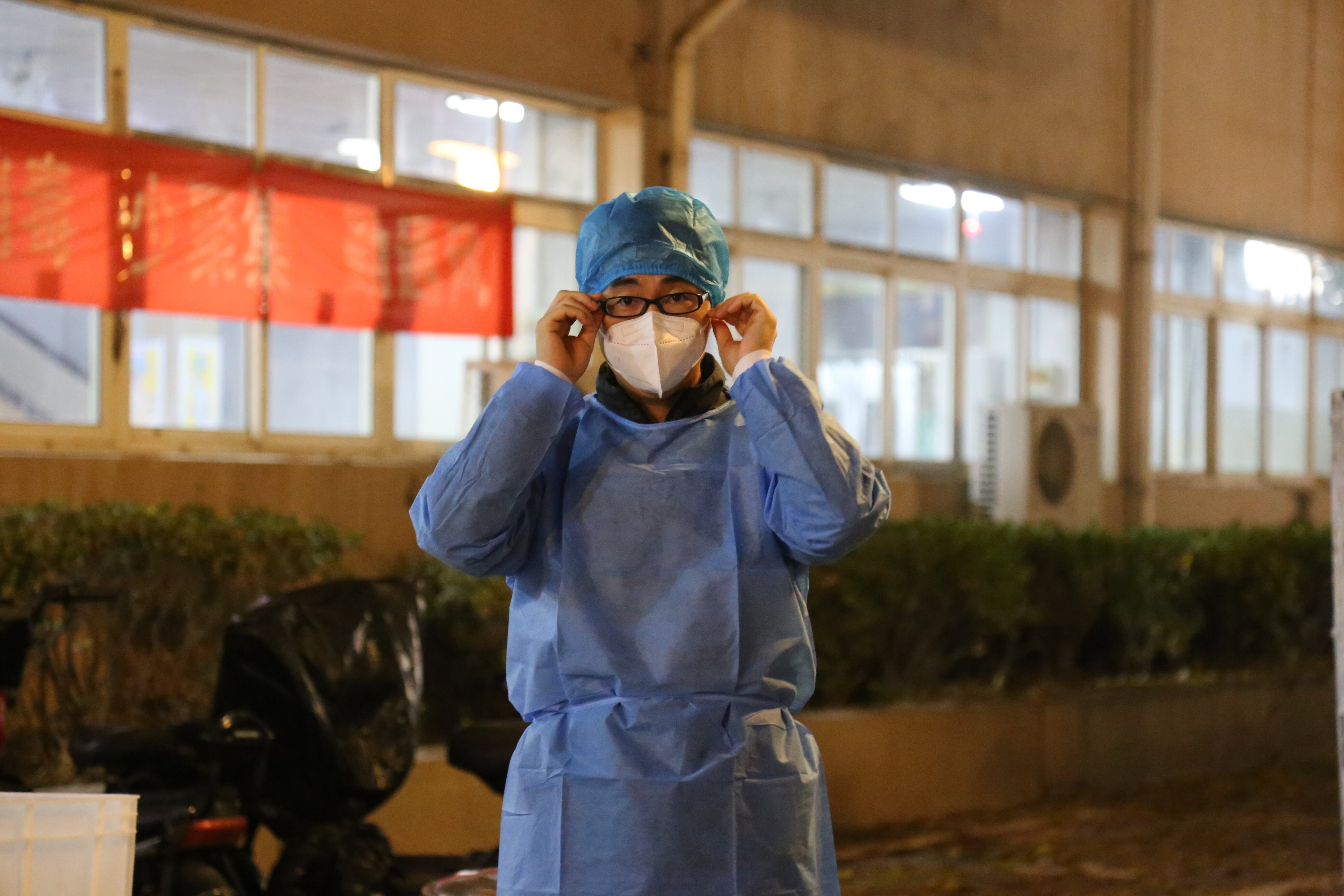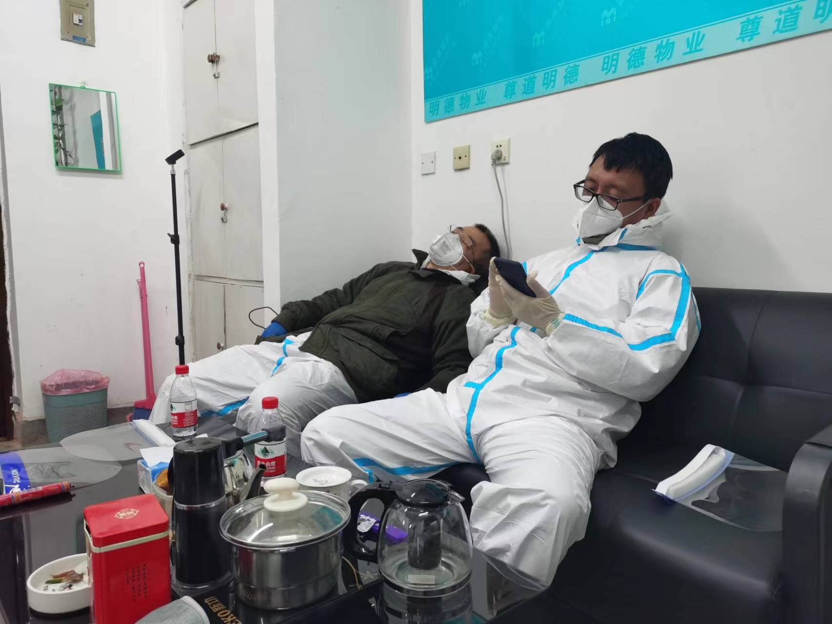17日20时许,公司19名男教工、6名女教工换好防护服,作为第一批宿舍楼层长,进驻男女生宿舍各楼层。当晚转运的员工涉及1000余人,这项繁重的工作全部由楼层长来负责,从得到名单到下楼转运,需要在极短的时间内完成,楼层长们几乎一夜没有合眼,休息的时候,他们有的坐在板凳上靠着墙,有的坐在废纸箱上,更多的只能席地而坐。