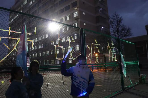 接着,冬奥会志愿者带领大家做了两遍热身操,并组织同学们排队,为同学们分发荧光棒等装备。