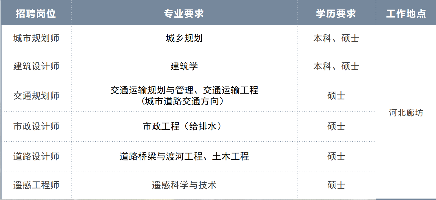 实习生招聘专业:城乡规划、建筑学、交通运输规划与管理、道路桥梁与渡河工程、市政工程(给排水)、遥感科学与技术。实习生可享受绿色录用通道。